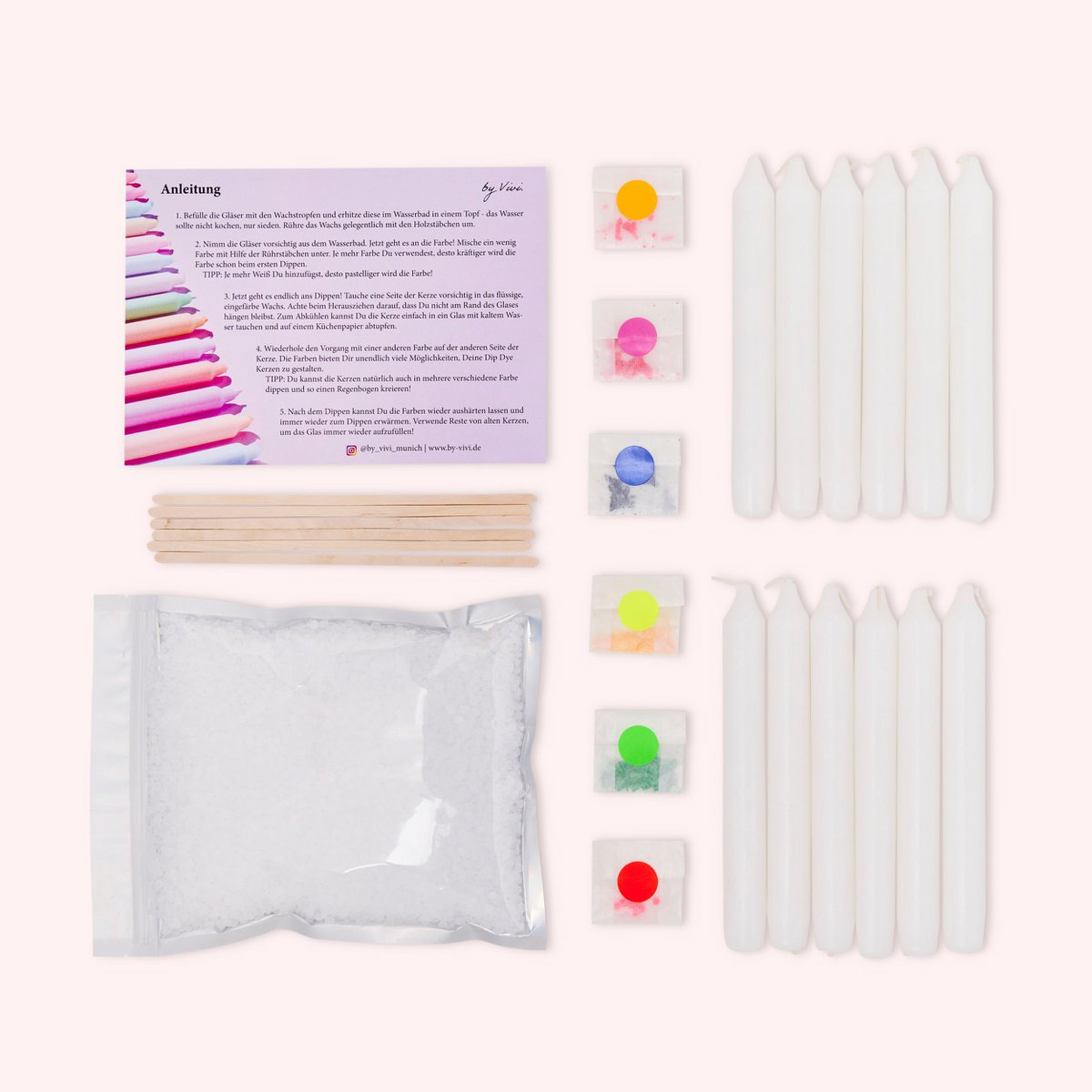 Vous pouvez enfin concevoir vous-même nos bougies Dip Dye chez vous grâce à notre kit Do it Yourself, qui comprend presque tout ce dont vous avez besoin pour tremper des bougies ! Vous trouverez dans votre boîte : 12 bougies chacune 180x22mm Pastilles de cire de 500g à fondre et à tremper 6 couleurs : Neon Edition : jaune fluo, rose fluo, orange fluo, bleu fluo, vert fluo, rouge fluo Des bâtonnets pour remuer Mode d'emploi en allemand et anglais Quoi il vous faut également : De vieux verres comme par ex. B. Des pots de confiture ou de smoothie dans lesquels vous faites chauffer la cire Un pot et de l'eau De la bonne humeur pour plonger votre vie en couleur ! Conçu et assemblé avec amour à Munich. Quantité 1 = Boîte DIY de 12 bougies Couleurs : jaune fluo, rose fluo, orange fluo, bleu fluo, vert fluo, rouge fluo Durée de combustion : environ 6 heures par bougie Numéro d'article : DIY5 Veuillez toujours vous assurer de ne jamais laisser les bougies allumées sans surveillance ! Délai de livraison 3-6 jours ouvrables. La quantité commandée pour les détaillants est de 1 pièce = 1 unité d'emballage (4 cartons). © Conception par Vivi.